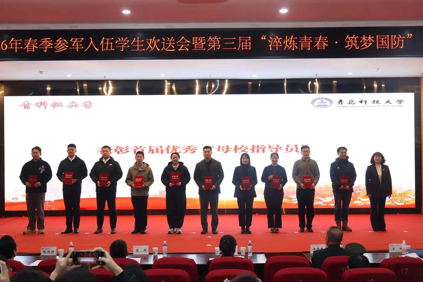 王军伟寄语新入伍学生扎根军营强军报国。张洪坤为应征入伍毕业生颁发青岛科技大学国防奖学金奖牌和荣誉证书。学校党委学生工作部(武装部)部长王丽宣读了《青岛科技大学2026年春季市北区应征入伍大学生士兵名单》,并为首届“优秀母校指导员”颁发荣誉证书。后勤管理处处长匡荣富为“荣军驿站”窗口颁发牌匾。
